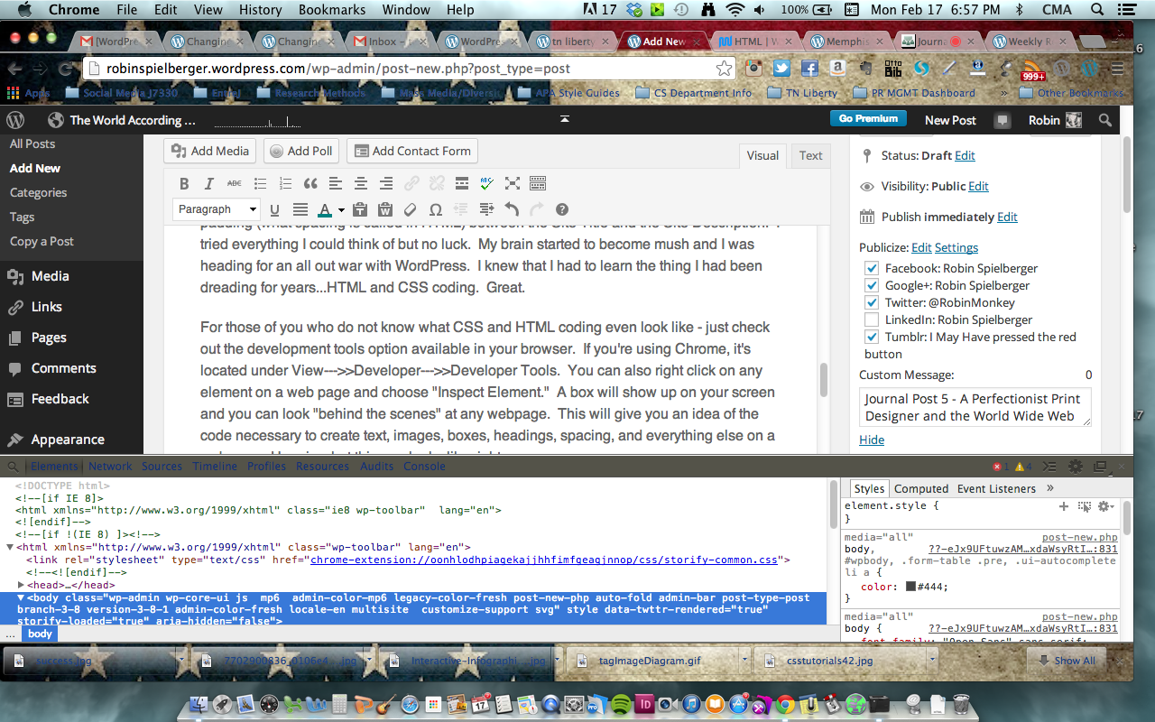 For those of you who do not know what CSS and HTML coding look like – check out the development tools option available in your browser. If you’re using Chrome, it’s located under View—>>Developer—>>Developer Tools. You can also right click on any element on a web page and choose “Inspect Element.” A box will show up on your screen and you can look “behind the scenes” at any webpage. This will give you an idea of the code necessary to create text, images, boxes, headings, spacing, and everything else on a webpage. Here is what this one looks like right now. Check out the white box highlighted at the bottom of this screen shot. That’s what I was about to “mess with.”