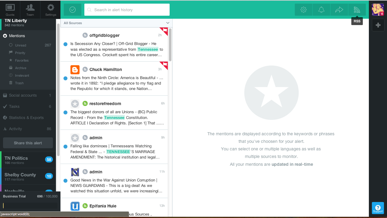 Next, I decided to go ahead and set up an alert system for my blog topic of liberty in Tennessee. I have used several different “alert” systems in the past and decided to set up Mention, first.