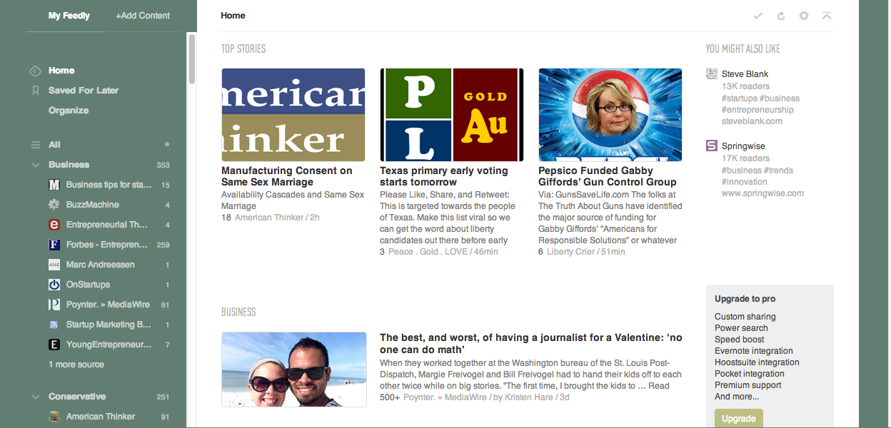 I first set up the Google Chrome Browser desktop app for Feedly from the Chrome Web Store. It works quite well, plus it has a visually appealing interface. If you can’t tell by now, I like ALL the things to look pretty, as well as neat and clean. I used Feedly’s search box to enter terms that were relevant to Tennessee and liberty and politics. Plus, I also added a few blogs and sites manually. For the most part – Feedly was helpful for major news sites and major blogs. I also added more journalism influencers, startup kings, and media sites to Feedly, because it seems to be the best bet for actually aggregating my everyday news.